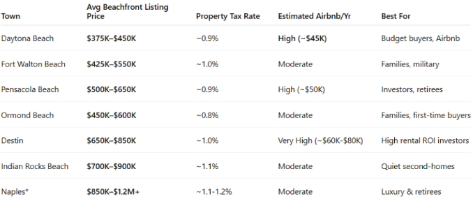 If your budget runs under $400K, Daytona Beach and Fort Walton Beach remain top choices for oceanfront units. For those seeking strong rental ROI with higher entry prices, Destin and Pensacola deliver exceptional yield. And if luxury, quiet prestige, and long‑term value matter most, Naples is unbeatable.